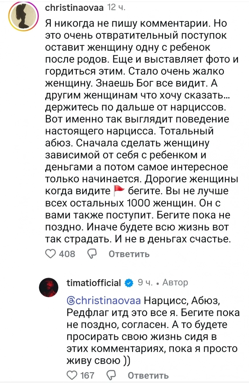 Инстаграм* ТиматиЭтот комментарий не остался незамеченным самим 42-летним Тимати: "Нарцисс, абьюз, редфлаг и т. д. — это всё я. Бегите, пока не поздно, согласен. А то будете просирать свою жизнь, сидя в этих комментариях, пока я просто живу свою".