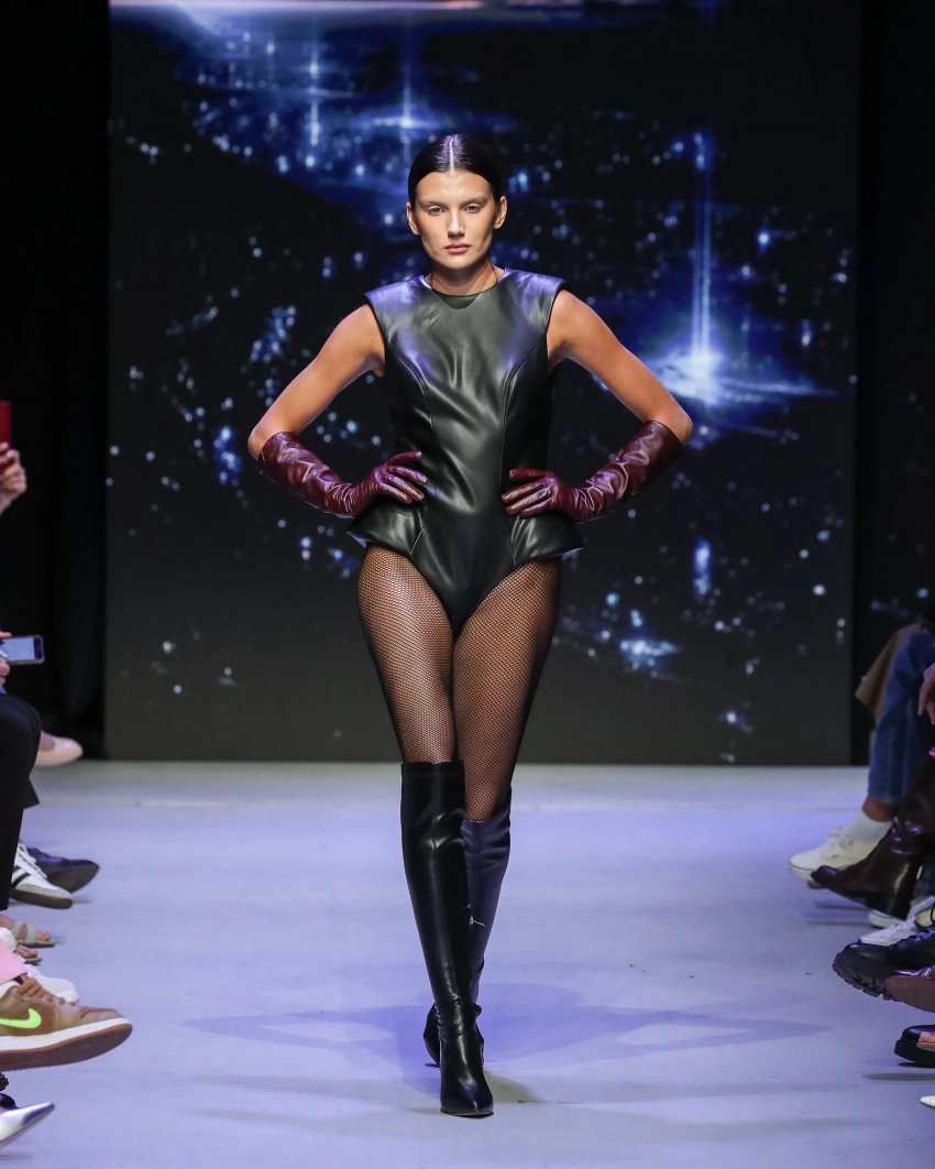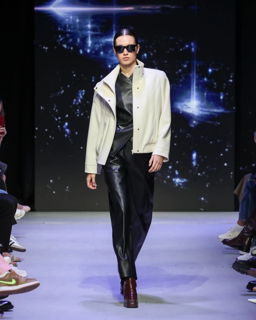 Показ MasterpeaceКроме этого, запомнился показ Roshi. Московский бренд показал коллекцию, вдохновлённую футуристичной архитектурой. Дизайнер сделал акцент на костюмах и верхней одежде, добавив комплекты из плотного хлопка и кожи с геометричными линиями. В коллекцию вошли кожаные платья, рубашки прямого кроя и свободные косухи. Финалом показа стало появление певца Мити Фомина, который вышел на подиум вместе со своим питомцем.