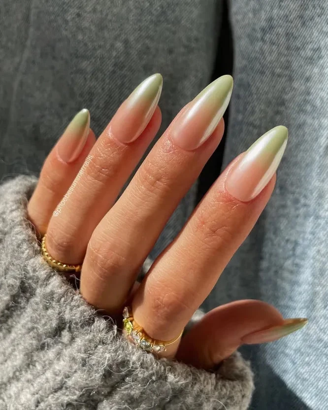 Лаконичный и освежающий дизайн для тех, кто любит естественность. Нюдовая база и растушеванные шалфейно-зеленые кончики создают эффект омбре, который гармонично сочетается с летними образами. Используй спонж, чтобы добиться плавного перехода цвета.