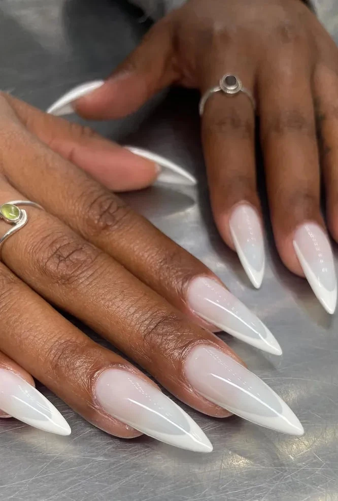 Необычный подход к классике — два оттенка белого. Молочная база и непрозрачные снежные кончики создают мягкий, но выразительный дизайн. Особенно красиво смотрится на острых длинных ногтях, придавая им аристократичную элегантность.