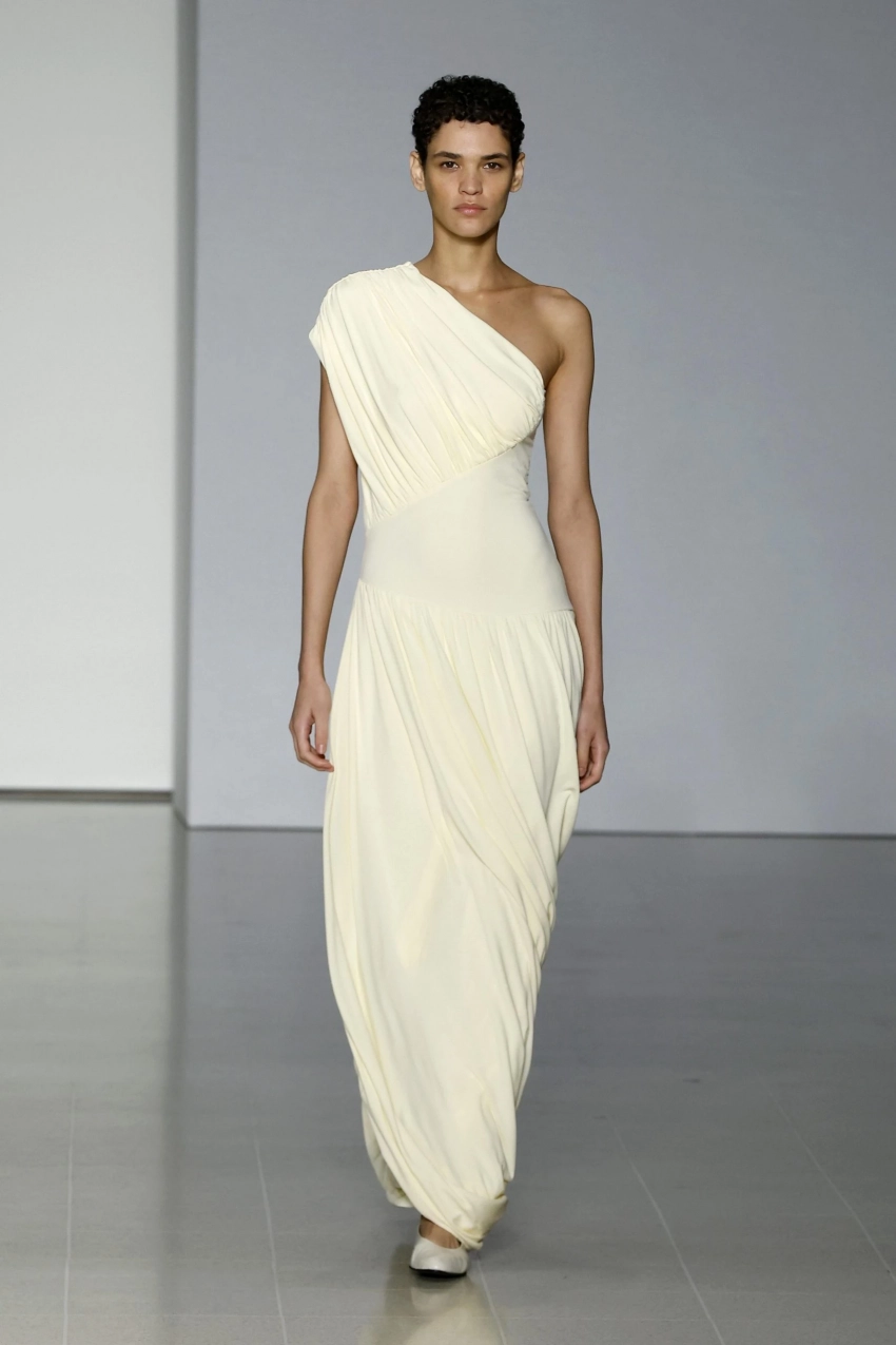 Вдохновленные Древней Грецией, платья с асимметричными драпировками, косыми вырезами и мягкими складками стали настоящим хитом 2025 года. Эти модели не только выглядят необычно, но и подчеркивают фигуру, скрывая возможные нюансы в зоне бедер и живота.