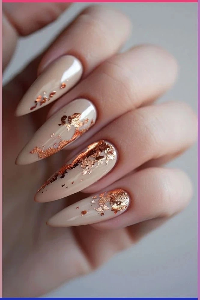 Тонкие листы золота (или серебра) превращают маникюр в произведение ювелирного искусства. В 2025 году поталь используют: