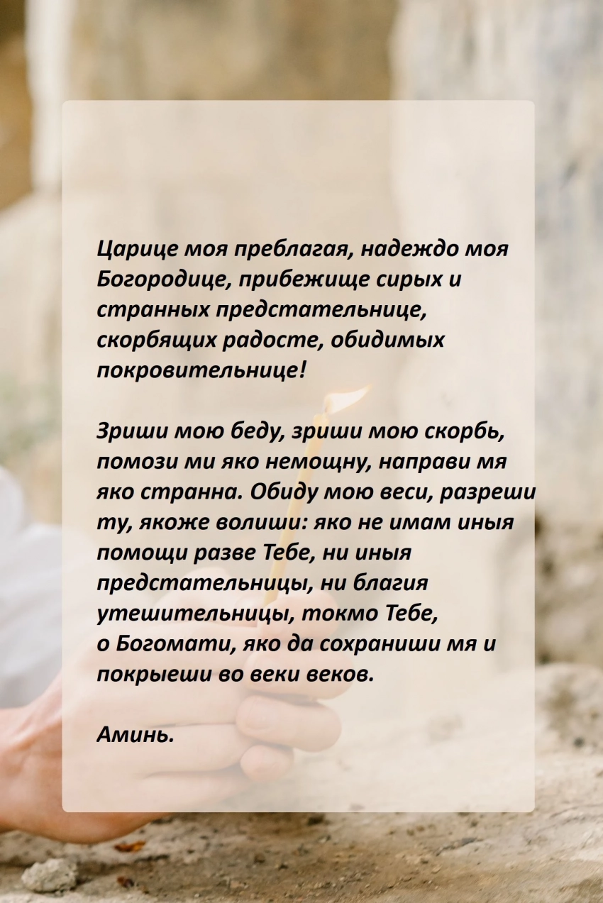 Перед молитвой важно подготовиться: привести в порядок душу и тело — умыться, надеть чистую одежду, избегая яркого макияжа. Важно освободить разум от тревог и суеты, сосредоточившись на искреннем общении с Богородицей. Молитва должна быть чистой, искренней и без корыстных желаний, выражая глубокую веру и смирение.